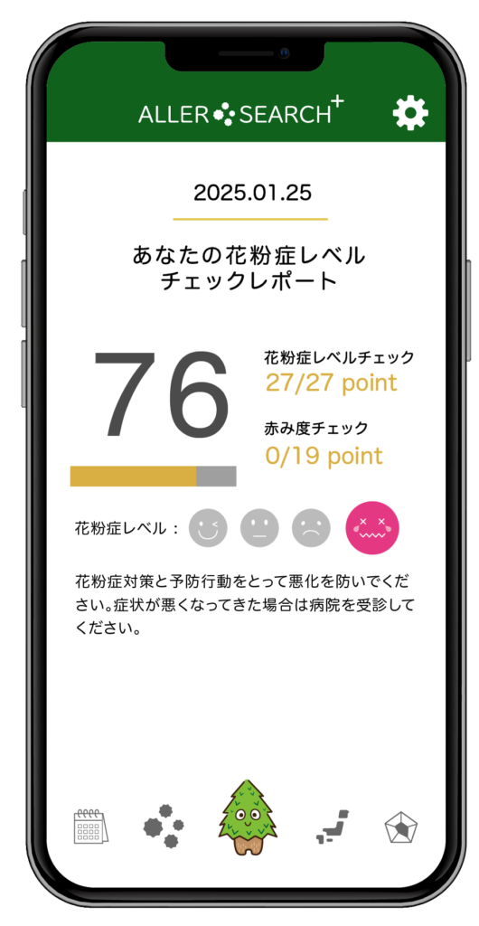 花粉症の症状に関する質問とスマホカメラによる目の赤みの測定から、あなたの花粉症レベルを点数化します。また、あなたの花粉症タイプを目・鼻・喉などのタイプに分け、見える化します。