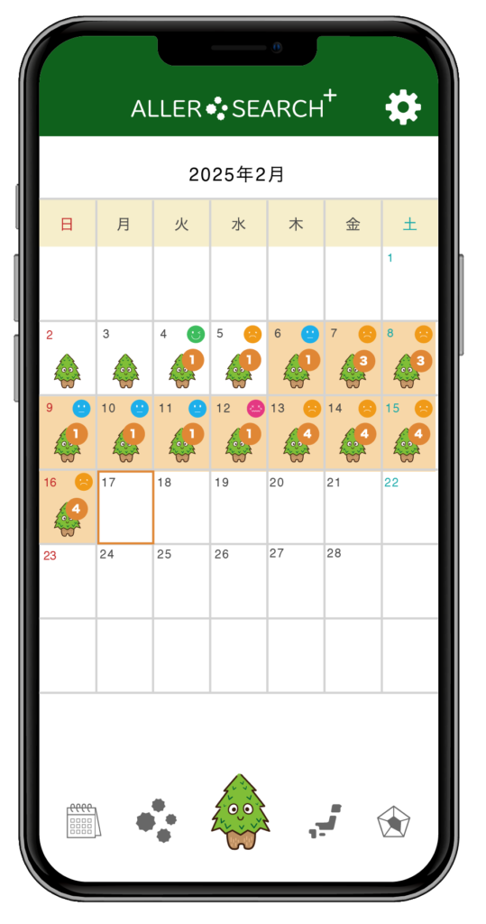 日々の花粉症の症状や実施した対策をカレンダー上に記録することができます。毎年の花粉症開始時期を記録することで、翌年の花粉症開始前の予防や対策を忘れずにできるようになります。